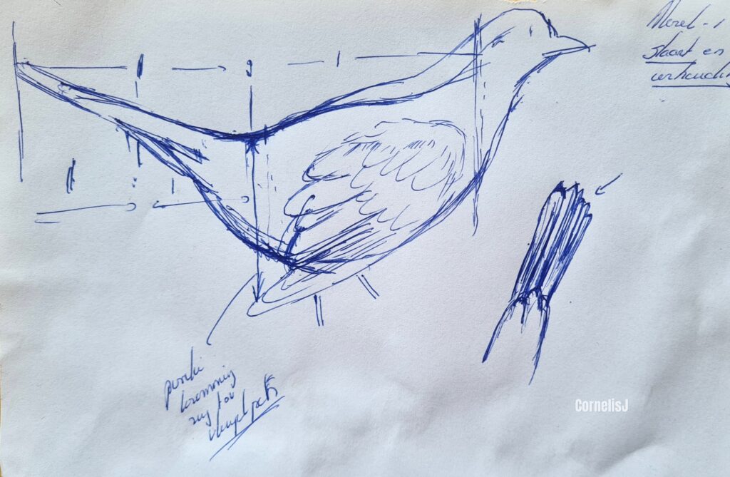 Eerst een schets gemaakt van de stand en de verhoudingen. De stand iets uitgesprokener en dreigender gemaakt dan je meest bij een merel ziet, maar geeft voor het beeld net dat beetje extra.