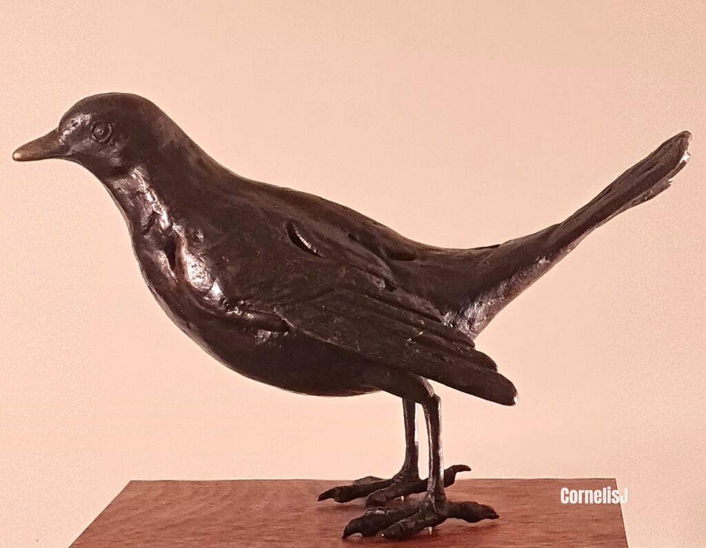 Het was mijn eerste vogelbeeld in was en had geen noemenswaardige ervaring in de volgende stappen om tot een bronzen afgietsel te komen. Dus aan de bronsgieter gevraagd om de mal en het was afgietsel te maken, het afgietsel in te vormen en het brons te gieten, het gietsel te ciseleren en te patineren en om de sokkelpin te plaatsen! Zie het resultaat: